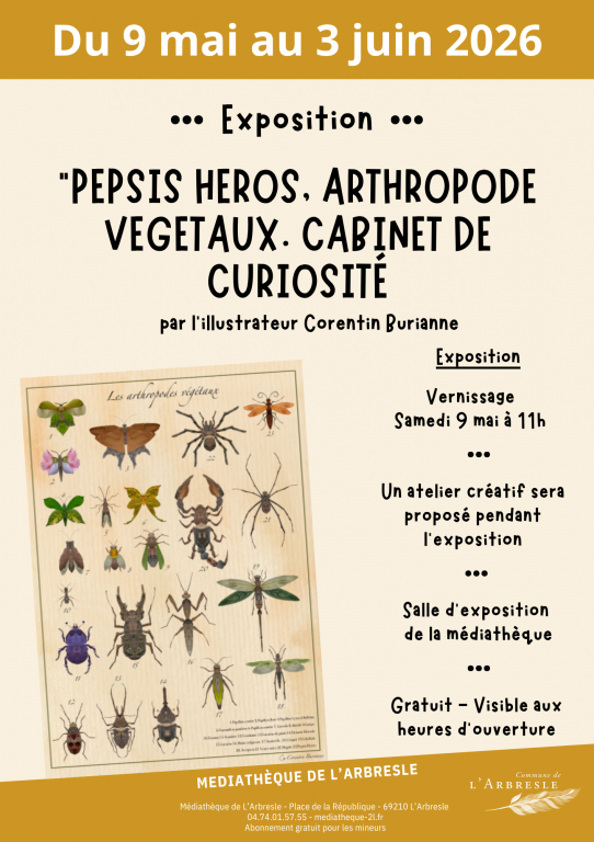"Pepsi Heros, arthropode végétaux. Cabinet de curiosité" est une exposition présentée par Corentin Burianne du 9 mai au 3 juin, à la salle d'expositions de la médiathèque