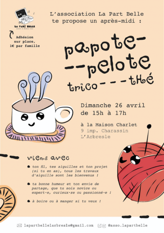 L'association La Part Belle vous invite à son après-midi Papote-Pelote le dimanche 26 avril, de 15h à 17h, 9 impasse Charassin à L'Arbresle